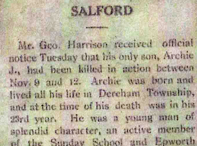 While serving in France he was killed in the Battle of Passchendaele on November 12, 1917, at age twenty-two. A newspaper clipping described Harrison as “a young man of splendid character, an active member of the Sunday School and Epworth League.”