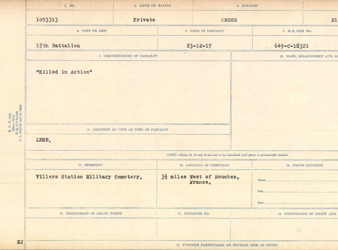 Elias Howard Cross was born at Norwood, Ontario, on October 19, 1898. A teamster, he enlisted on February 3, 1917, with the 254th Battalion. In France, he was assigned to the 15th Battalion, and fought at the Second Battle of Passchendaele. Elias was the only casualty for the battalion on December 23, 1917, when he was killed by machine gun fire during the relief of his battalion from the front line in the Lens left Sector. Elias’s parents were especially distraught at his death, for they had earlier lost their eldest son, Thomas, during fighting in October 1916. Elias Cross is buried in Villers Station Cemetery, Villers au Bois, France.