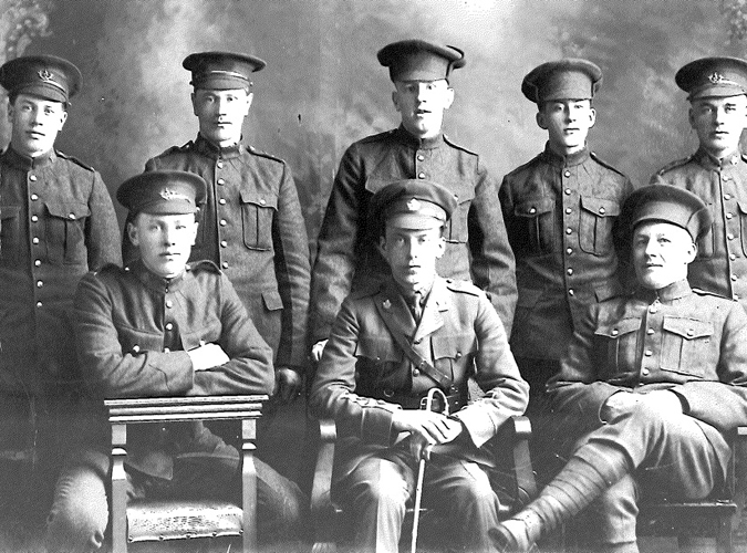 In this photo, taken in late summer 1916 in Winnipeg, at least half of the eight men shown are from the same Icelandic Canadian settlement, Logberg, Saskatchewan. Logberg, or “Law Rock” is where the speaker annually reads the laws to the Icelandic Parliament. Sitting in the front row, middle, is Lieutenant Jon Einarsson. It was unusual for the Icelandic soldiers to be commissioned—only 3 percent of those who enlisted were named officers. At least two of these men died in the war, Einarrson, at Passchendaele in October 1917, and Jon Thorarinson, far left, back row, who was killed at the Battle of "Vimy Ridge" Ridge in April 1917. Paul Egilsson, sitting front row, left, eventually married Einarsson’s sister. Einarsson’s younger brother, Villi, is second from right, back row.