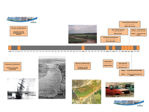 Construit par le gouvernement provincial en 1968, le pont-chaussée est décrit par les environnementalistes comme une mauvaise solution aux inondations. L’ouvrage a gravement endommagé la rivière Petitcodiac, stoppant son écoulement, créant des dépôts de sédiments excessifs et entravant la migration des poissons. Pour eux, l’enlèvement du barrage constitue une victoire pour laquelle ils se sont battus longtemps.