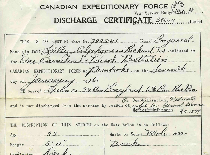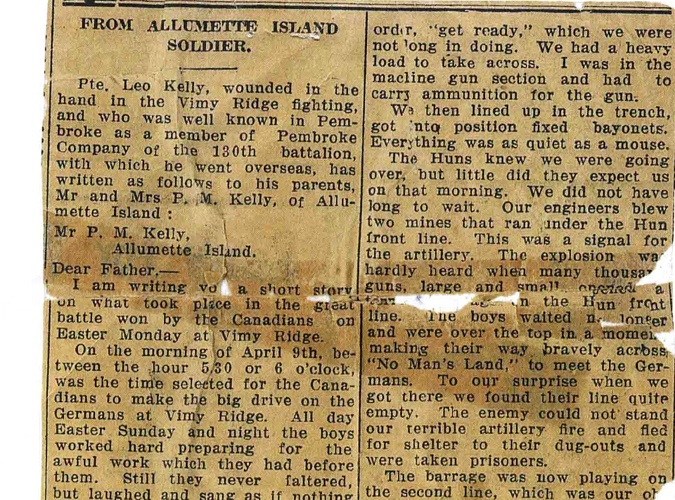 Kelly was born on May 5, 1897 in Alumette, Quebec—a primarily Anglophone community right near the Ontario border. He enlisted on January 7, 1916 with the 130th Battalion but was transferred thereafter to the 38th. From his hospital bed in 1917, the private put pen to paper and shared with his father details of the influential battle.
