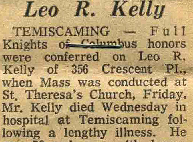 Kelly lived a long and happy life—living to see his 70th birthday and the birth of 16 grandchildren. He died peacefully in his home in Temiscaming, Quebec, in the late 1960s.
