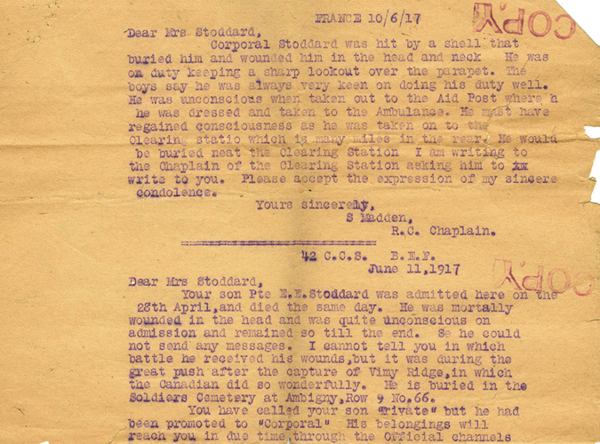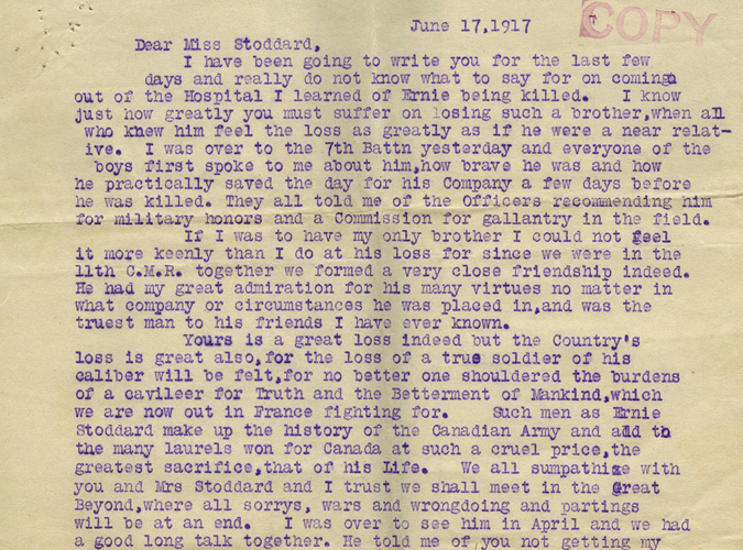 Ernest « Ernie » Stoddard de Clam Harbour, en Nouvelle-Écosse, s’enrôla en avril 1915 dans le 11e bataillon canadien de fusiliers à cheval. Il fut tué au combat le 28 avril 1917, près de la crête de Vimy.