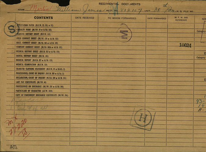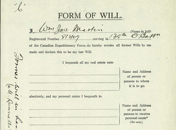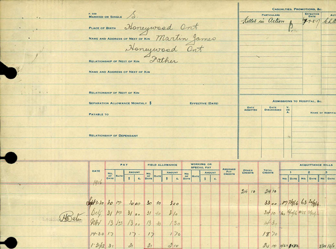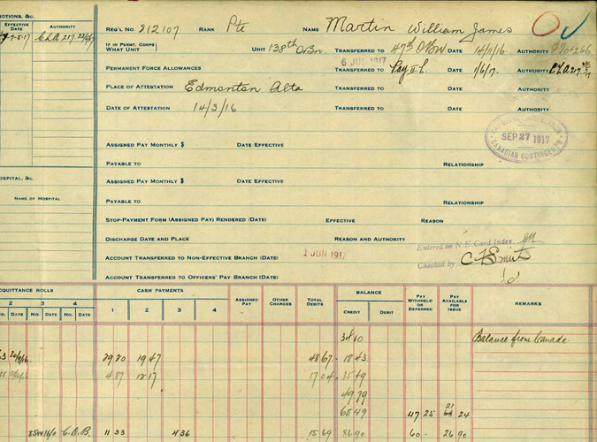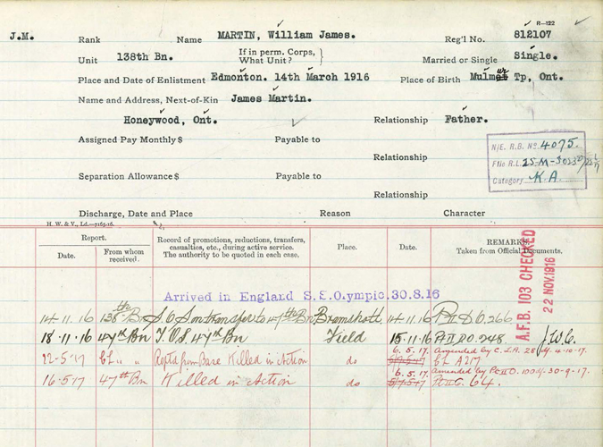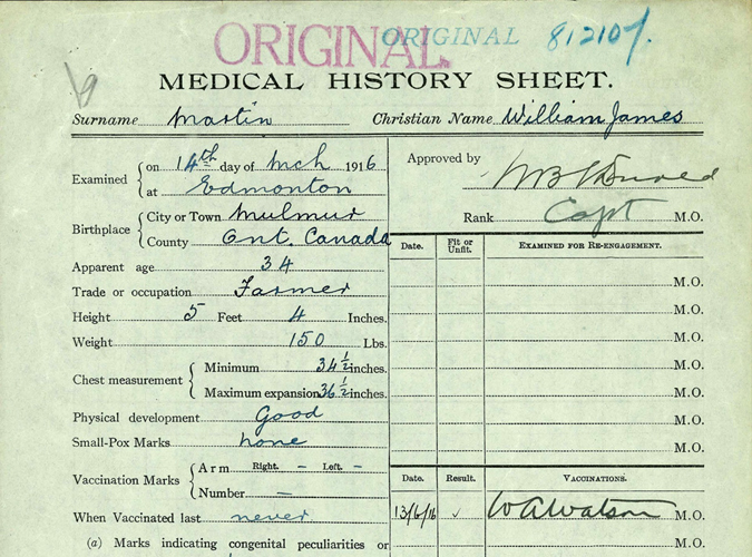 William James Martin, or Uncle Willie to his family, was born in Honeywood, Ontario on November 7, 1881. He was the youngest son of James and Ann Martin, and brother to John, George and Sarah. John, being the eldest, took over the family farm in Honeywood so George and William found employment elsewhere. George, in 1908, travelled to the High Prairie, Alberta area and homesteaded (SW-14-74-17 & S1/2-13-74-17). George was married to Charlotte Hazel McLellan. He also became a teacher when the school was built in 1908 and taught there for 2 and a half years. They remained in the area until 1918 when they moved to Spruce Grove, Alberta where he taught school again, and then moved again later to Edmonton. George passed away in 1964 and his wife in 1975. William also homesteaded nearby and remained there until he enlisted with the Canadian Expeditionary Force in 1916.