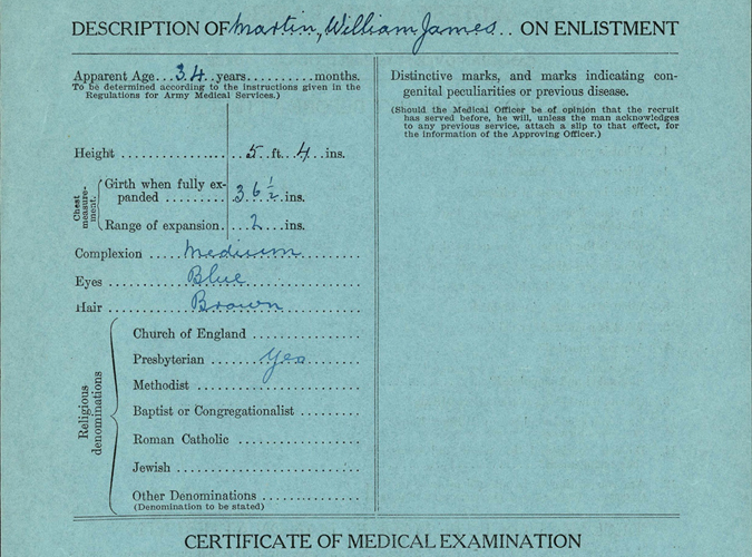 The Attestation Forms that he completed to enter military service provides little about his personal history but does provide some information about him. William stood 5’ 4” with blue eyes and brown hair. He listed his religion as Presbyterian. Finally, he named his father, James, as his next-of-kin which would become important later on.