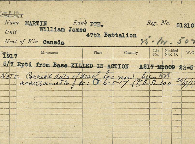 This last entry in the war diaries coincides with the day that William was killed in action, May 6, 1917. The explanation from the diary was that the fighting was very heavy during an operation to capture German trenches. A file from the Circumstances of Death Registers states “While repairing telephone wires during a bombardment at Lievin, he was instantly killed by a piece of an enemy high explosive shell, which hit him in the right side above the hip.” Where it states “ORs killed 26” in the war diaries, it can be presumed that one of these is William. OR stands for Other Ranks of which he was one. Nicholson in “Official History of the Canadian Army in the First World War: Canadian Expeditionary Force, 1914-1919” provides an explanation of what happened with the 47th battalion on the days of William’s death coinciding with the war diaries: