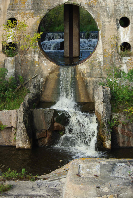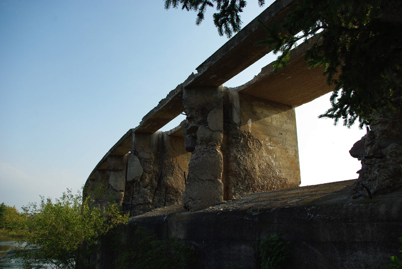 Ensuite, nous quittons le Lac du Bonnet et nous dirigeons vers la vieille ville de Pinawa. Sur l’autoroute 211E, nous voyons une affiche d’Énergie atomique du Canada limitée. Nous traversons une dense forêt d’épinettes et prenons au nord, sur la route provinciale 520, un chemin de gravier menant à la ville originale de Pinawa et à l’ancien barrage de Pinawa.