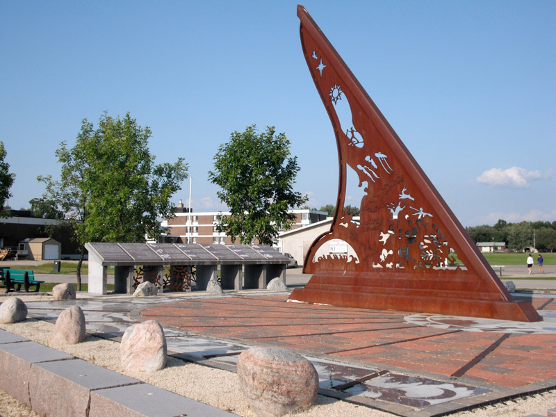 Plusieurs chevreuils broutent allègrement sur le boulevard. Ils semblent peu perturbés par l’arrivée des visiteurs. Au bout de cette route se trouve une imposante structure de métal, le Pinawa Heritage Sundial (le cadran solaire patrimonial de Pinawa). Construite dans le cadre d’un projet du Millénaire, cette oeuvre massive intègre douze thèmes liés au patrimoine, notamment les Premières nations, La Vérendrye et l’hydroélectricité.